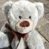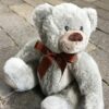 Dekorativ grå teddy bamse med gylden sløjfe om halsen