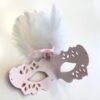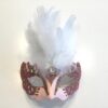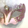 Dekorativ lille rosa maske med hvide fjer og flot malet motiv