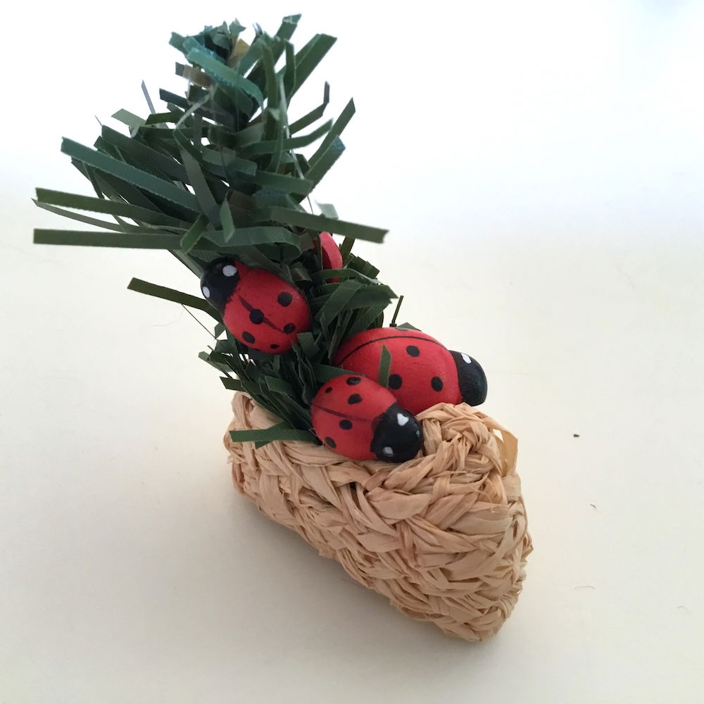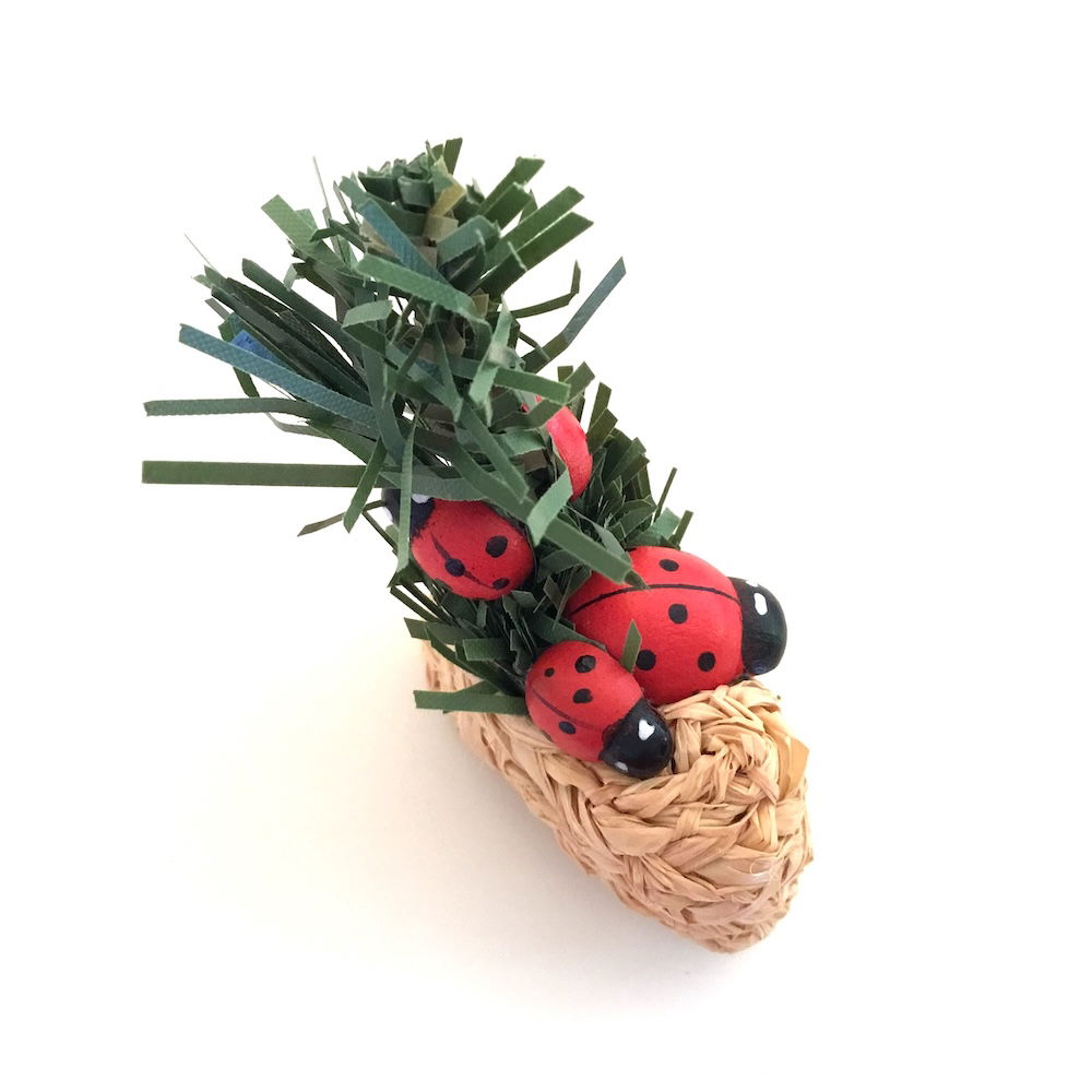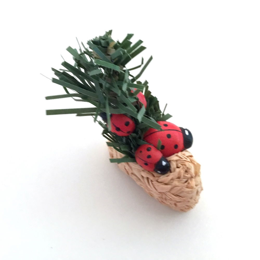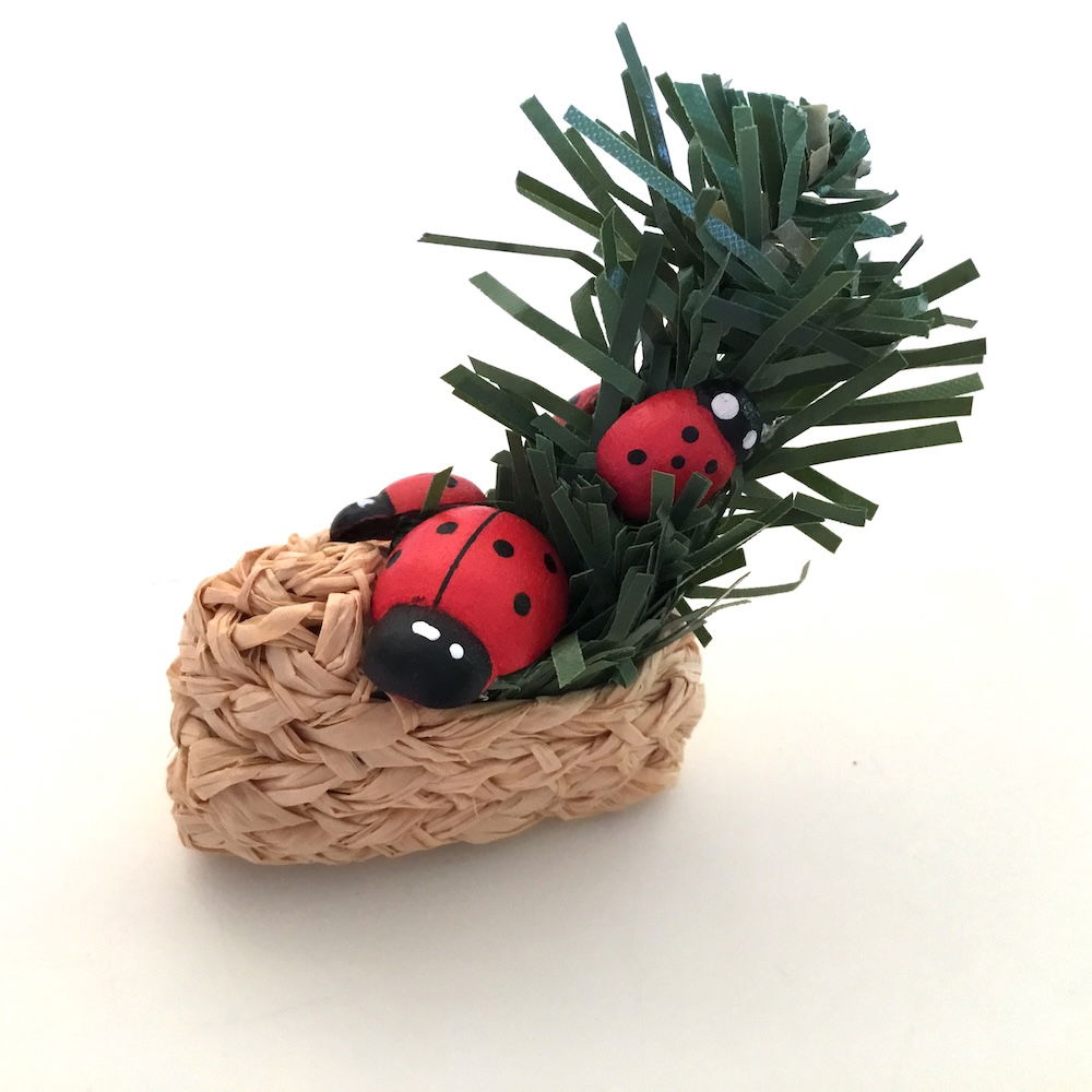 Dekorative mariehøns i sivsko sammen med en lille gran gren