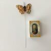 Sommerfuglen har ståltrådspind nedenunder, pinden er 15 cm lang.