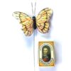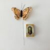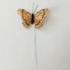 Sommerfuglen har ståltrådspind nedenunder, pinden er 15 cm lang.