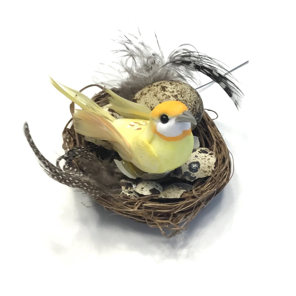 Fugl i rede med ægte æg og med spyd så reden kan sættes fast en dekorativ natur rede med fjer i.