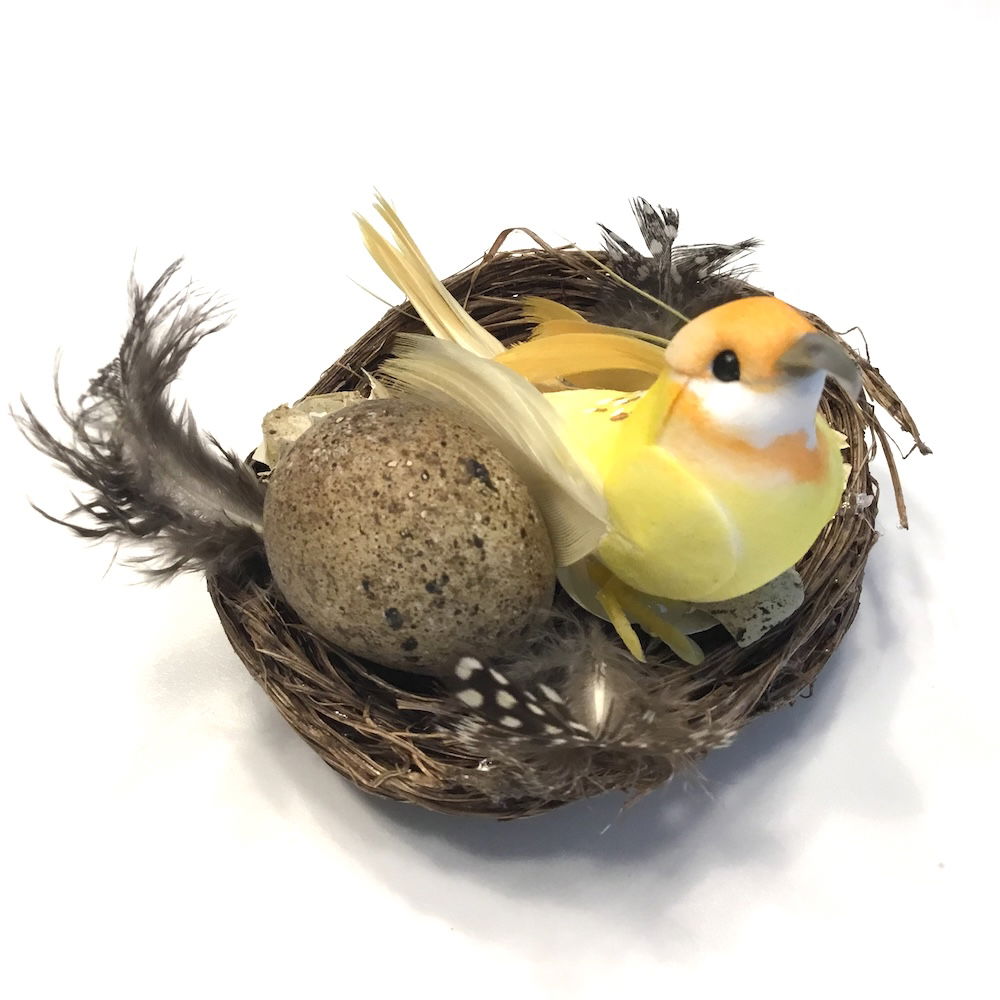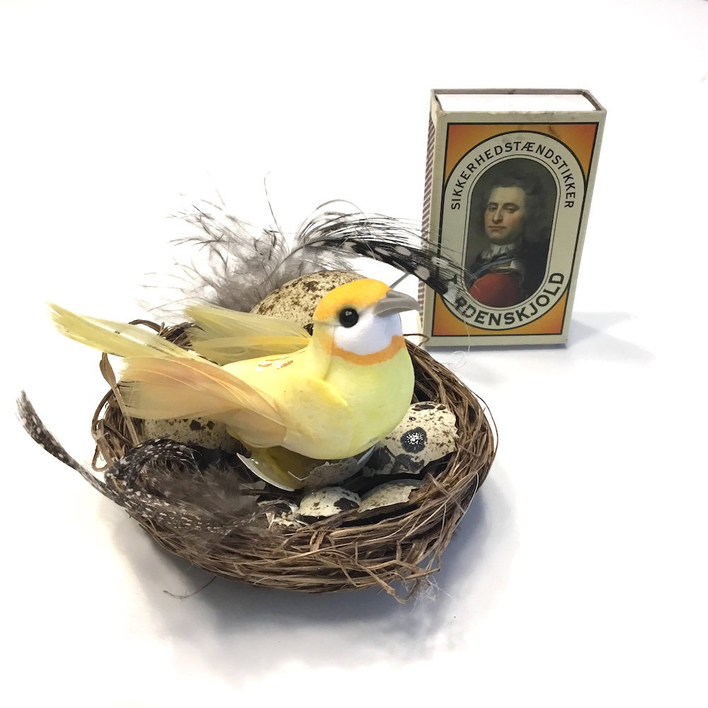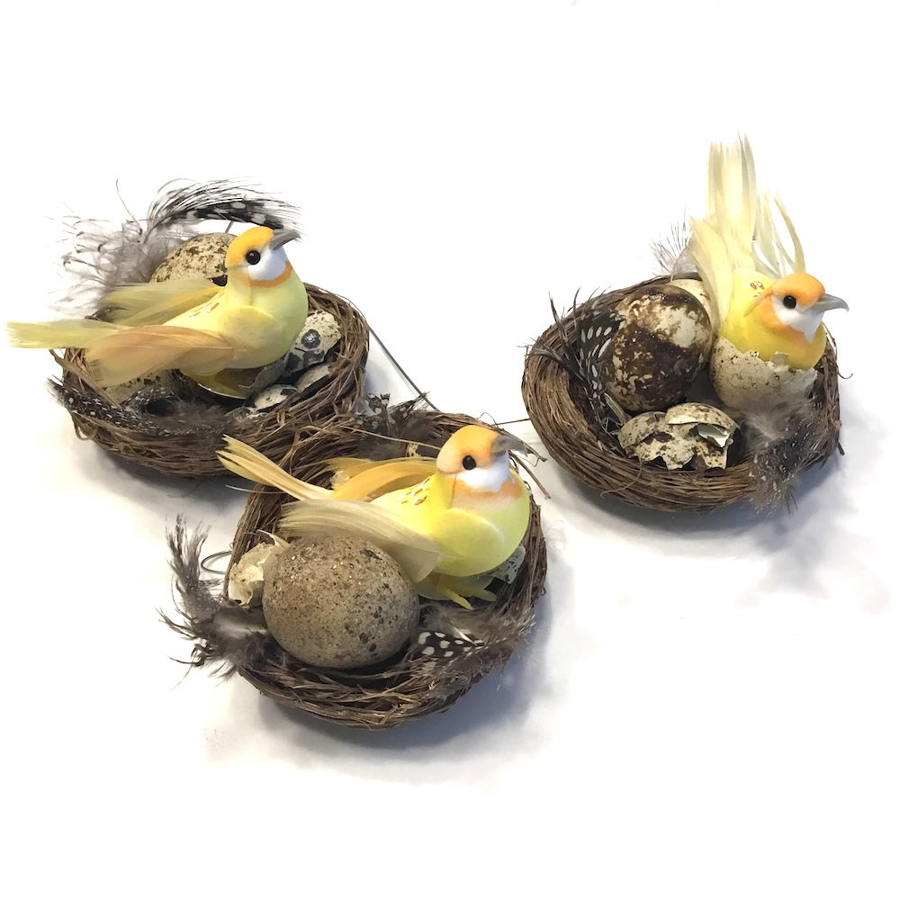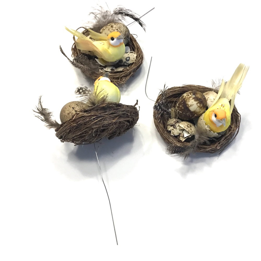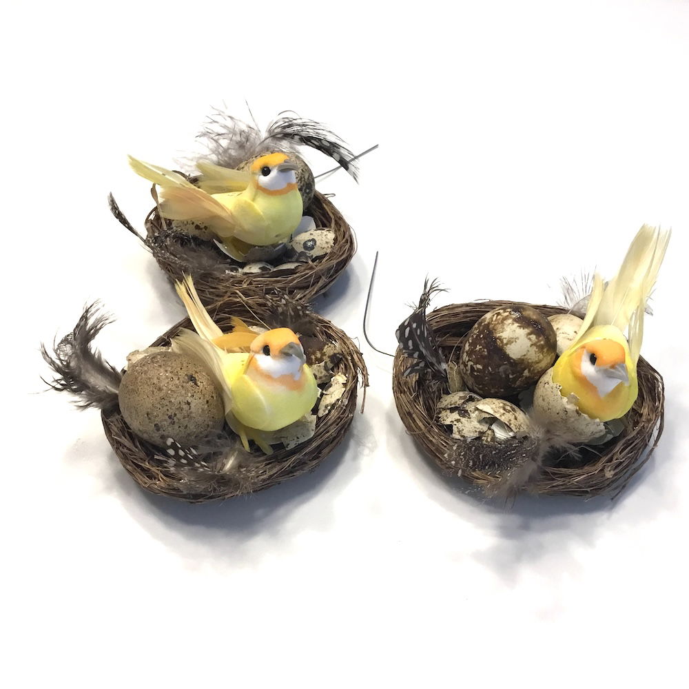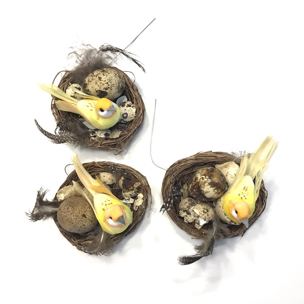 - Hver rede er håndlavet af naturmaterialer og pyntet med tre små ægte æg i naturlige farver.