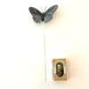 Sommerfuglen har ståltrådspind nedenunder, pinden er 20 cm lang.