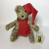 Halmbamse med rød nissehue der sidder ned denne bamsen er super solid og godt lavet
