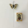 Sommerfuglen har ståltrådspind nedenunder, pinden er 15 cm lang.