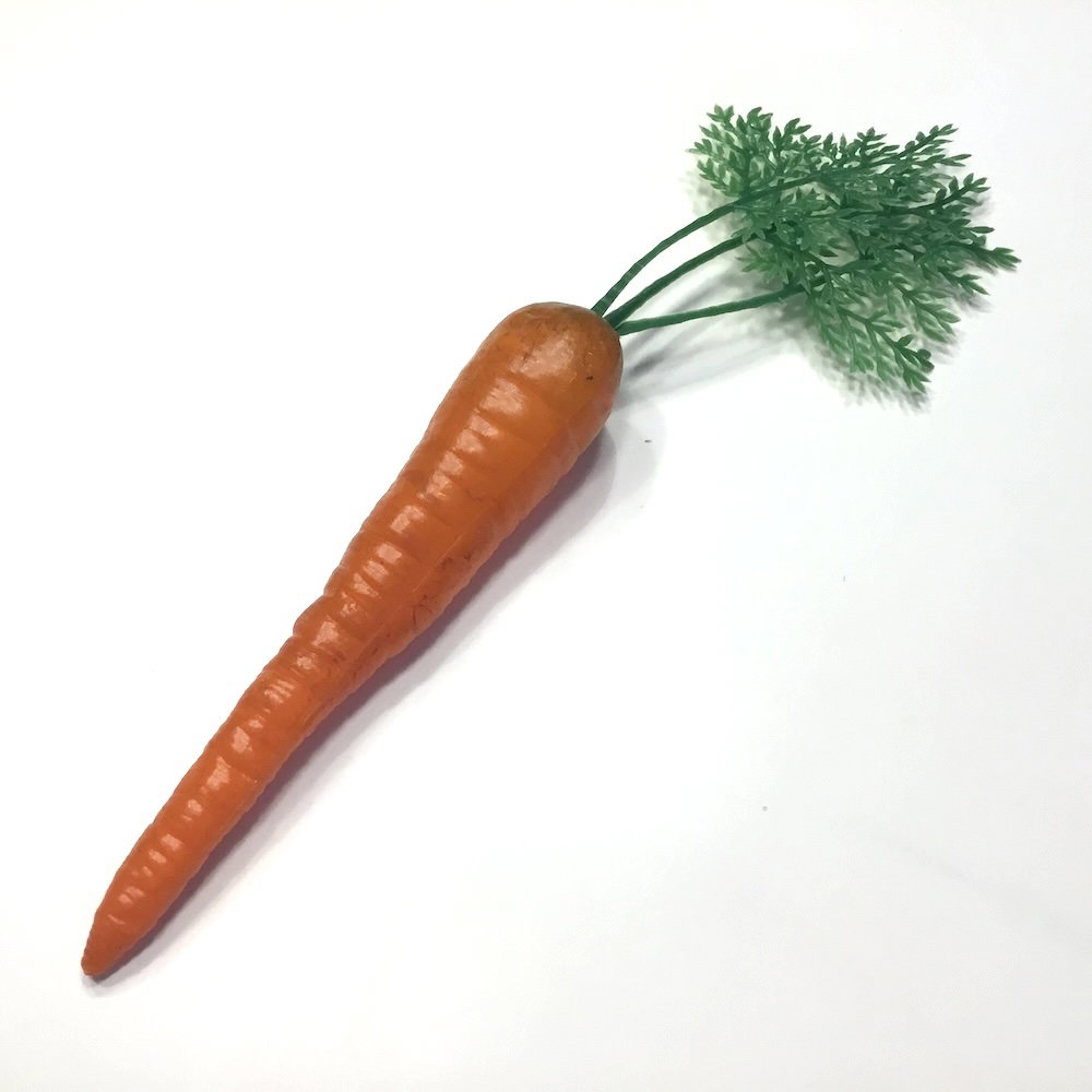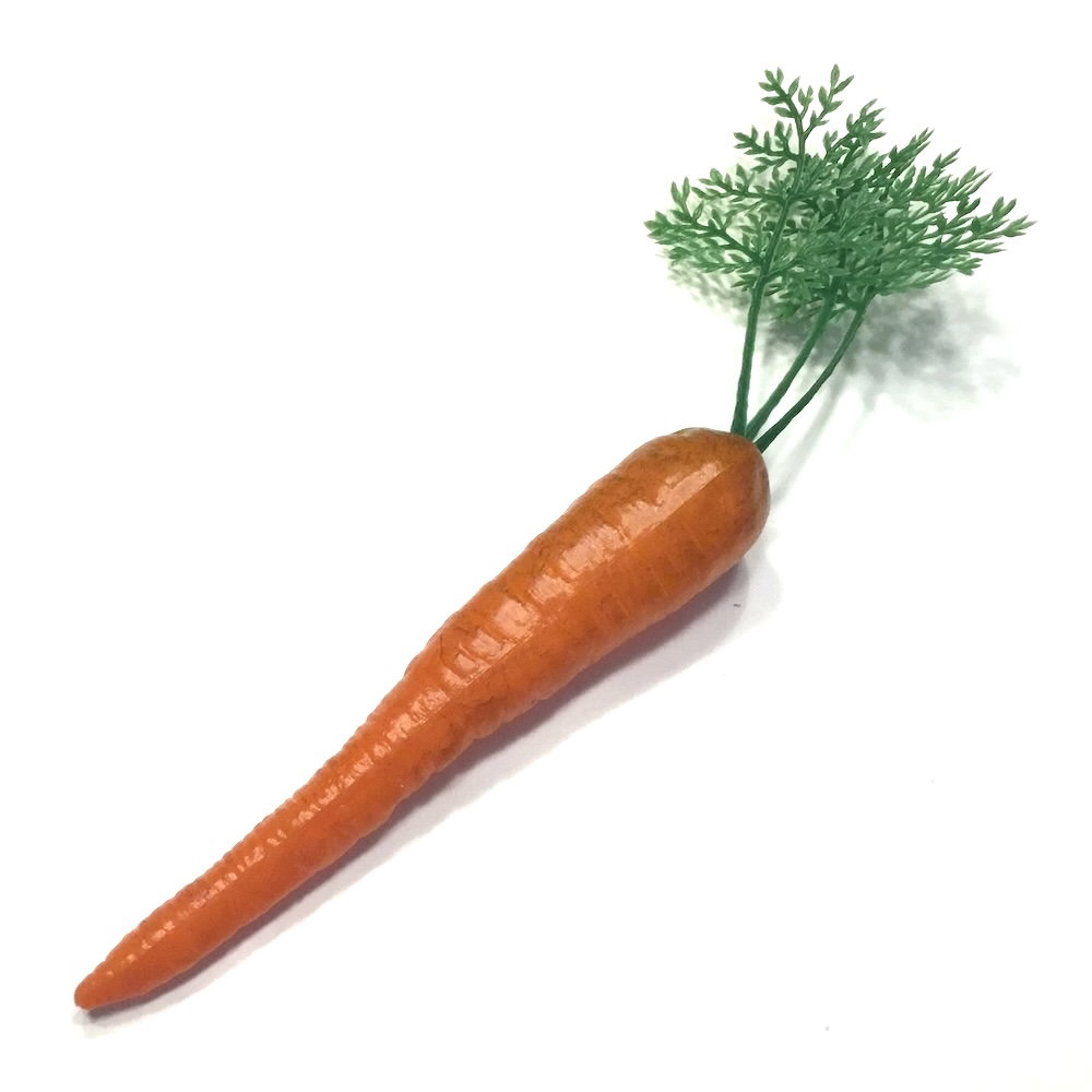 Denne gulerod er lavet af meget hård plastik og har en naturtro, ensfarvet orange farve. Den er så naturtro, at du skal helt tæt på eller have den i hånden for at se, at den er falsk.
